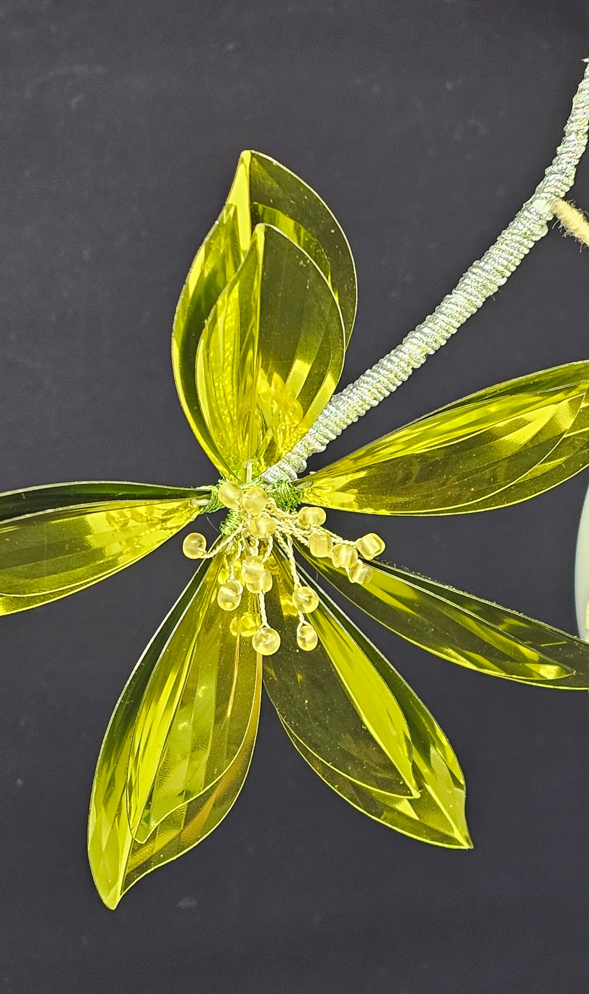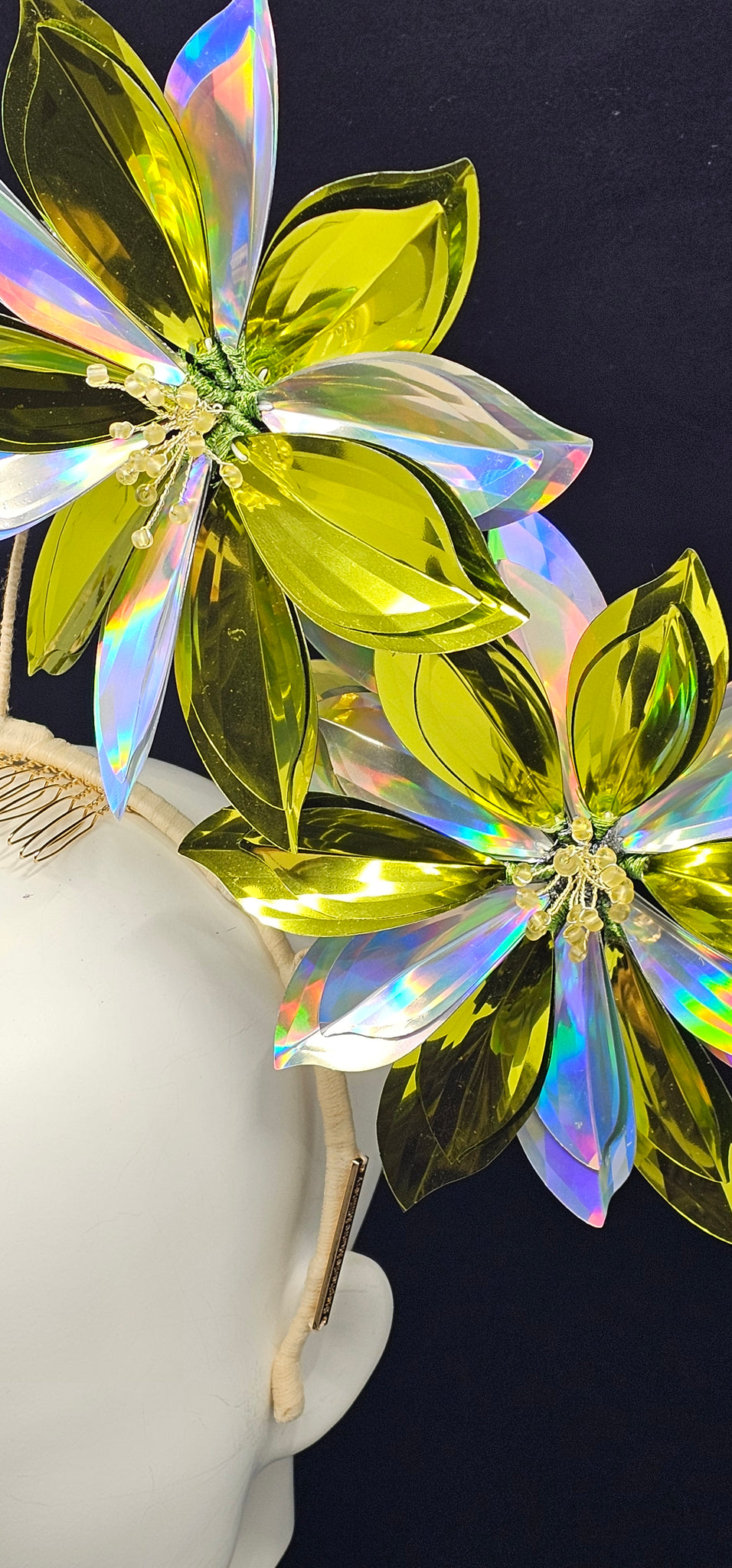 The ultimate in sparkle. The combination of chartreuse and iridescent sequin film comes alive in this headpiece. A true Showstopper.