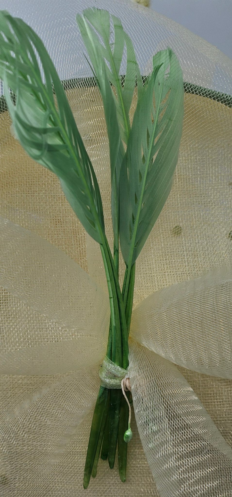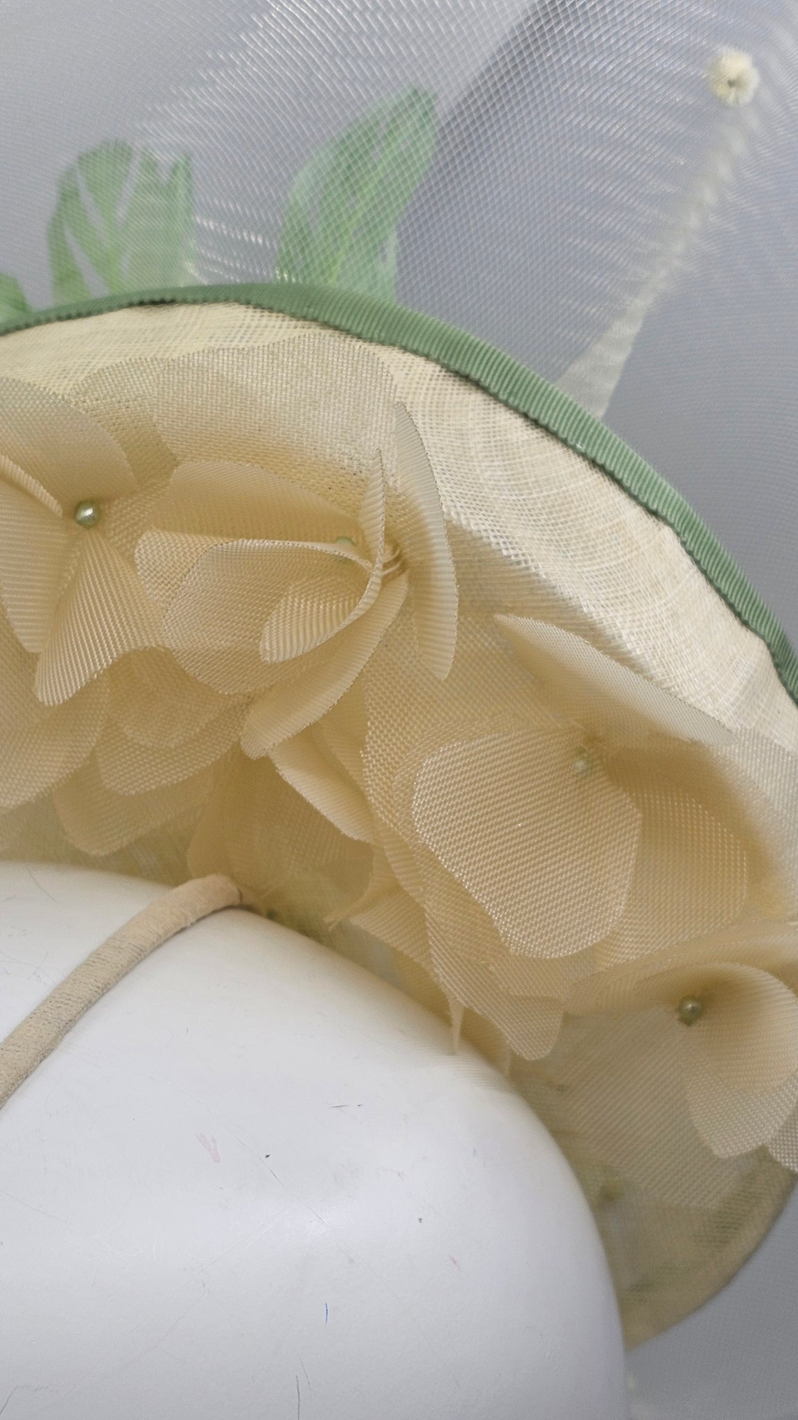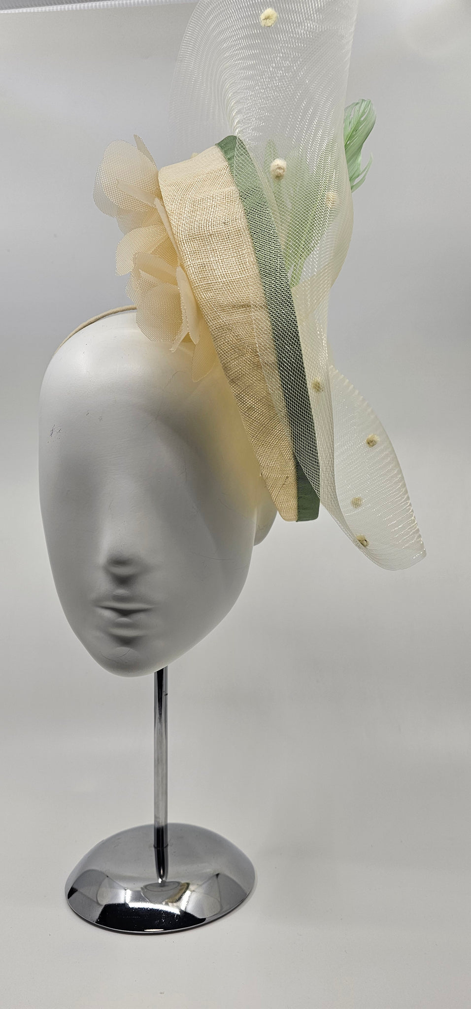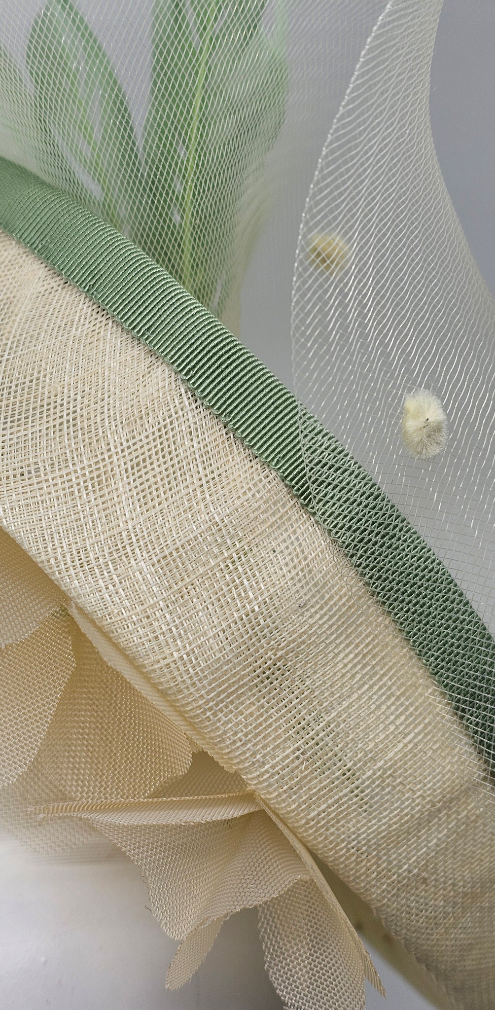 This headpiece beautifully combines cream and sage tones. It features a sinamay base accented with crinoline flowers, a classic swirl, and a final delicate touch of sage beads, making it a perfect choice for any event.