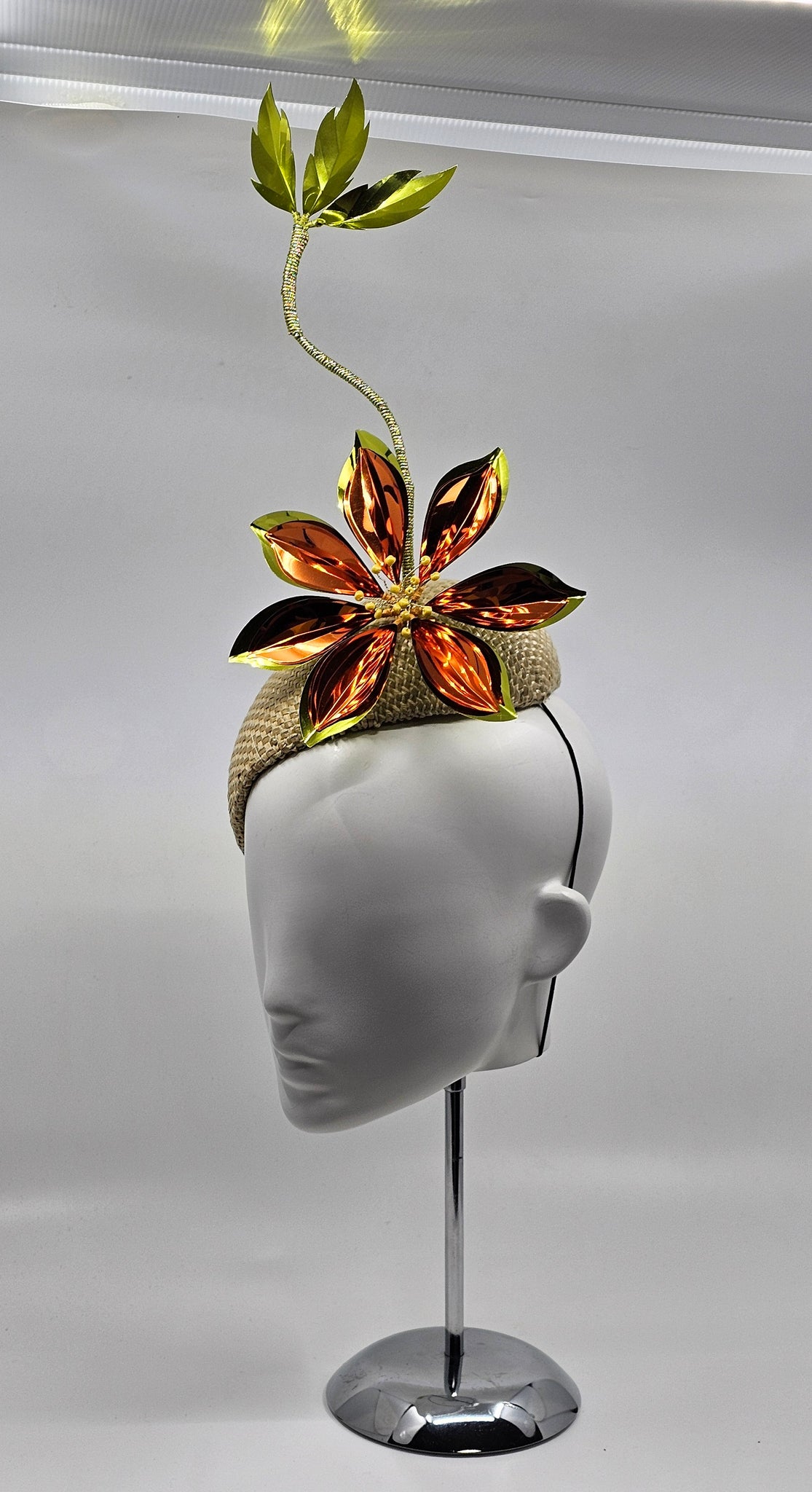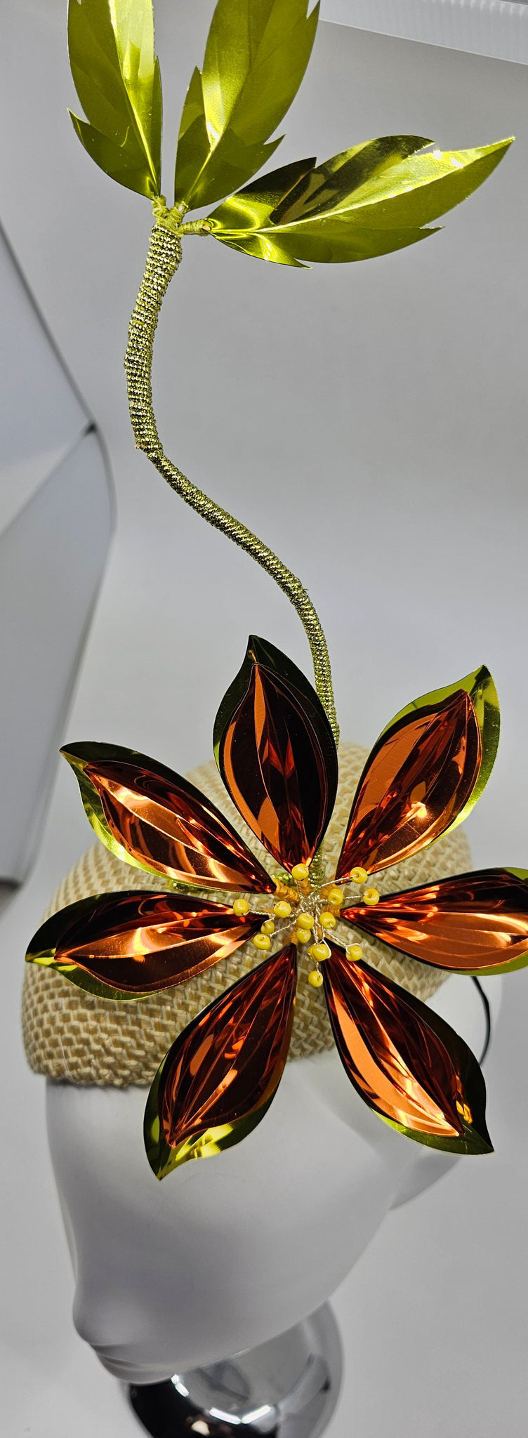 Command attention with this stunning, side-hugging fascinator. Crafted in a gorgeous pale gold Panama weave, it features a vibrant, citrus-burst flower arrangement in orange and chartreuse. Gold meets glow. This unique color combination doesn't just accessorize—it makes an entrance.